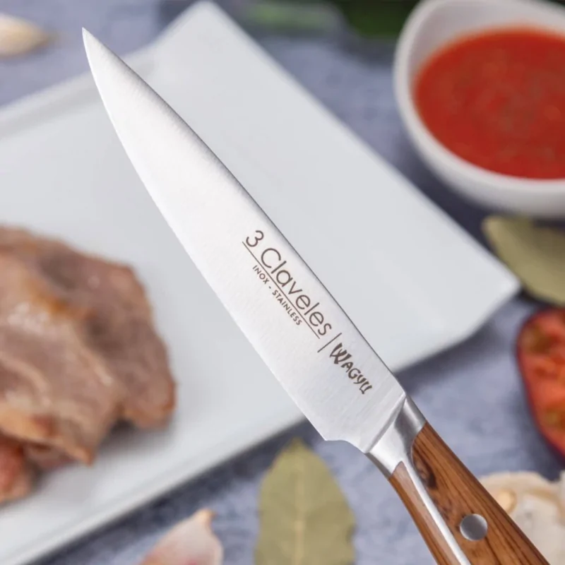 El Set Wagyu de 3 Claveles (Ref. 01048) está pensado para elevar la experiencia de degustación en su restaurante. Su principal característica es el filo liso de alta precisión, una cualidad muy valorada en la alta cocina. Mientras que la sierra desgarra, el filo liso corta quirúrgicamente, lo que permite apreciar la terneza de carnes premium como el solomillo, el entrecot o las piezas de larga maduración, manteniendo los jugos en cada bocado.