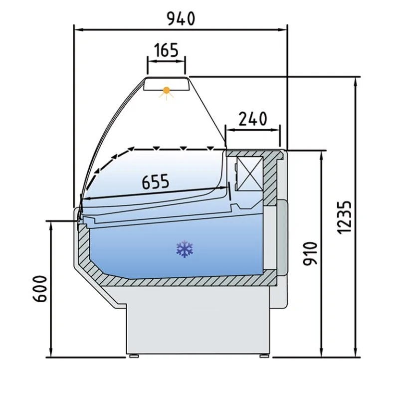 Vitrina expositoria refrigerada para charcutería, embutidos y lácteos. Diseño de cristal curvo, sin estantes y LED en parte superior.