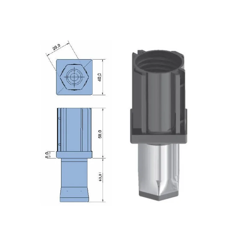 Pied réglable en polyamide 40x40mm acier inoxydable pièce mobile hexagonal. Altitude maximale: 50mm Poids: 85g