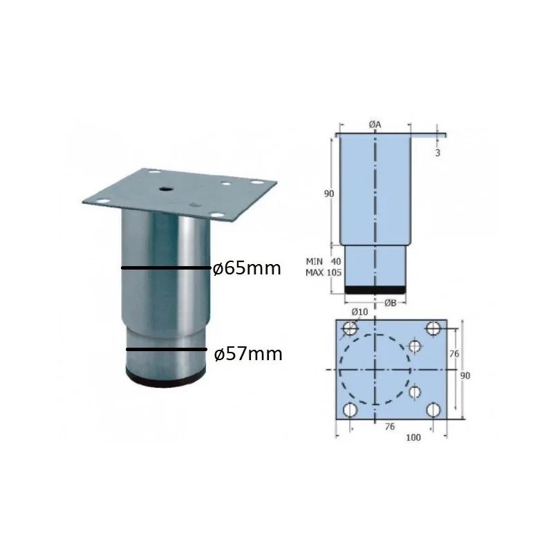 Pied réglable inox cylindrique en acier fixe et des pièces en mouvement. Pletina non centrée. Poids: 425gr